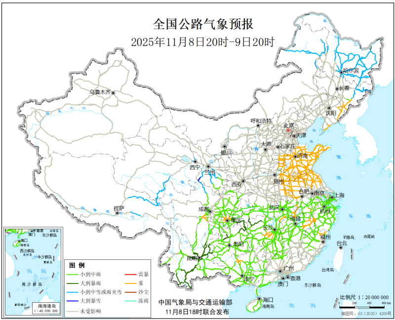 中国气象局与交通运输部2025年11月8日联合发布全国主要公路气象预报