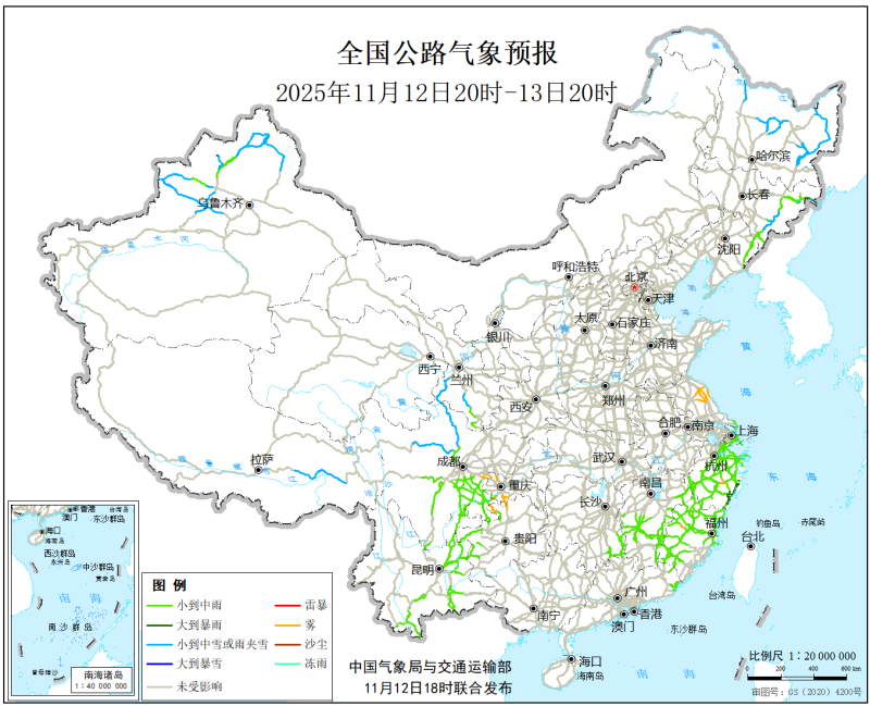 中国气象局与交通运输部2025年11月12日联合发布全国主要公路气象预报