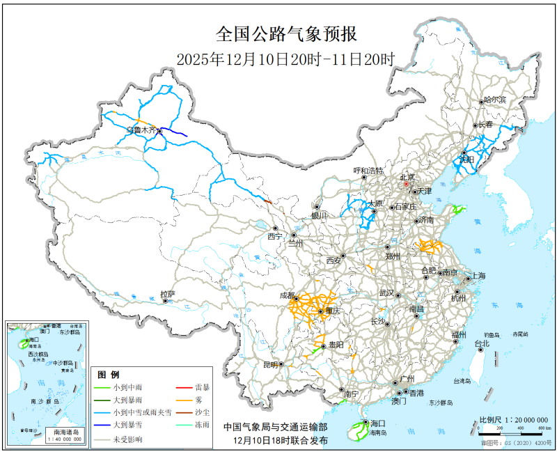 中国气象局与交通运输部2025年12月10日联合发布全国主要公路气象预报