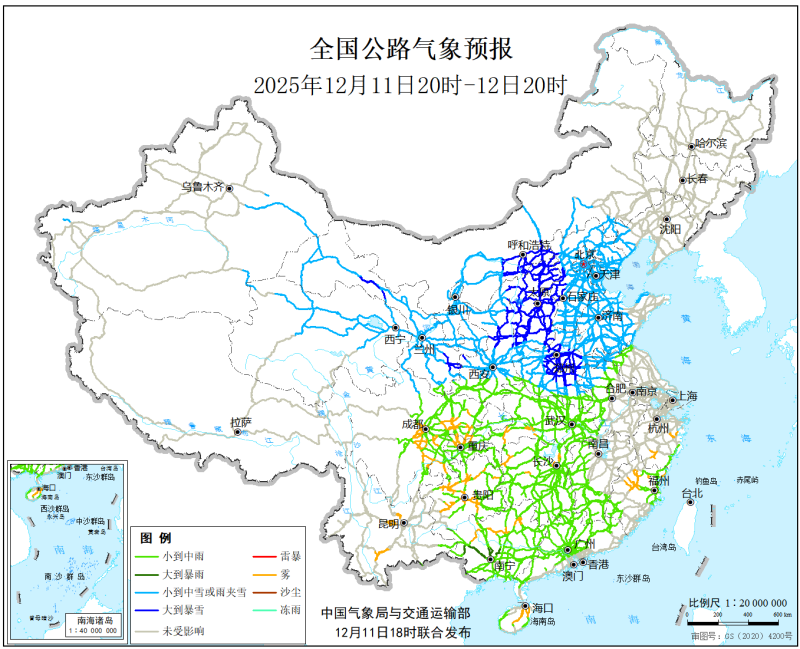 中国气象局与交通运输部2025年12月11日联合发布全国主要公路气象预报