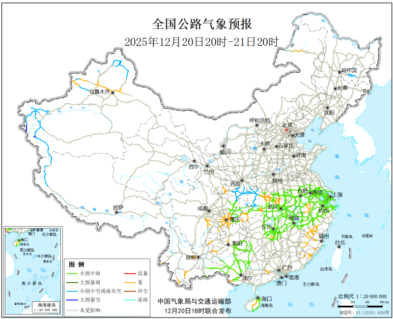 中国气象局与交通运输部2025年12月20日联合发布全国主要公路气象预报