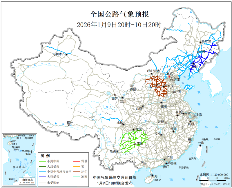中国气象局与交通运输部2026年1月9日联合发布全国主要公路气象预报