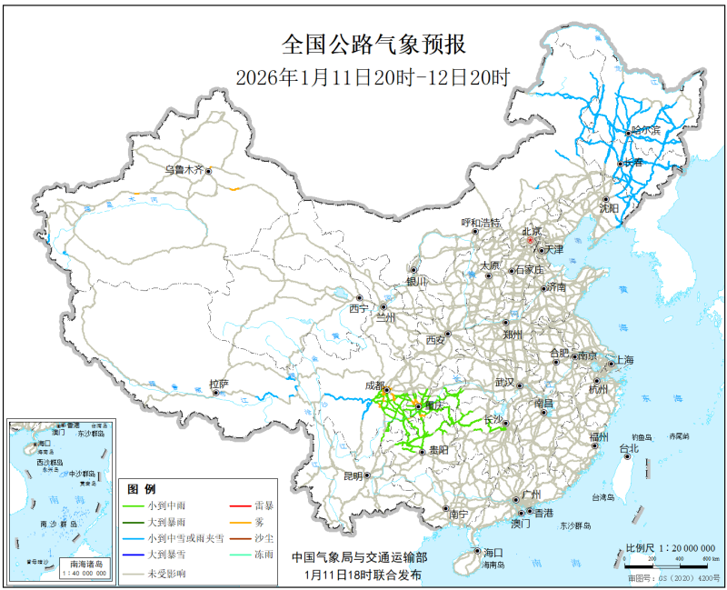 中国气象局与交通运输部2026年1月11日联合发布全国主要公路气象预报