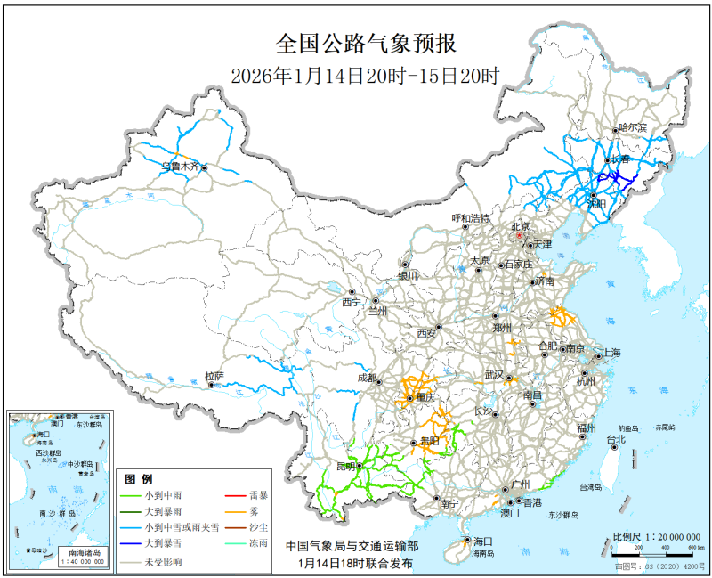 中国气象局与交通运输部2026年1月14日联合发布全国主要公路气象预报