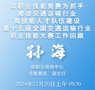 各位网友,大家好!欢迎来到交通运输部网站在线访谈。本期访谈我们邀请了第十五届全国交通运输行业职业技能大赛组委会副主任,交通运输部职业资格中心党委委员、副主任孙海同志,为我们介绍交通运输行业职业技能大赛有关情况。孙主任,欢迎您!