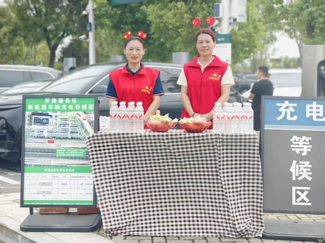 大墅、宁国、君王、丰乐等服务区在充电桩附近搭建“暖心补给站”和休息区,为排队等待充电的司乘免费提供矿泉水、零食、定制帆布包及充电指引等服务,营造了温馨舒适的出行氛围。