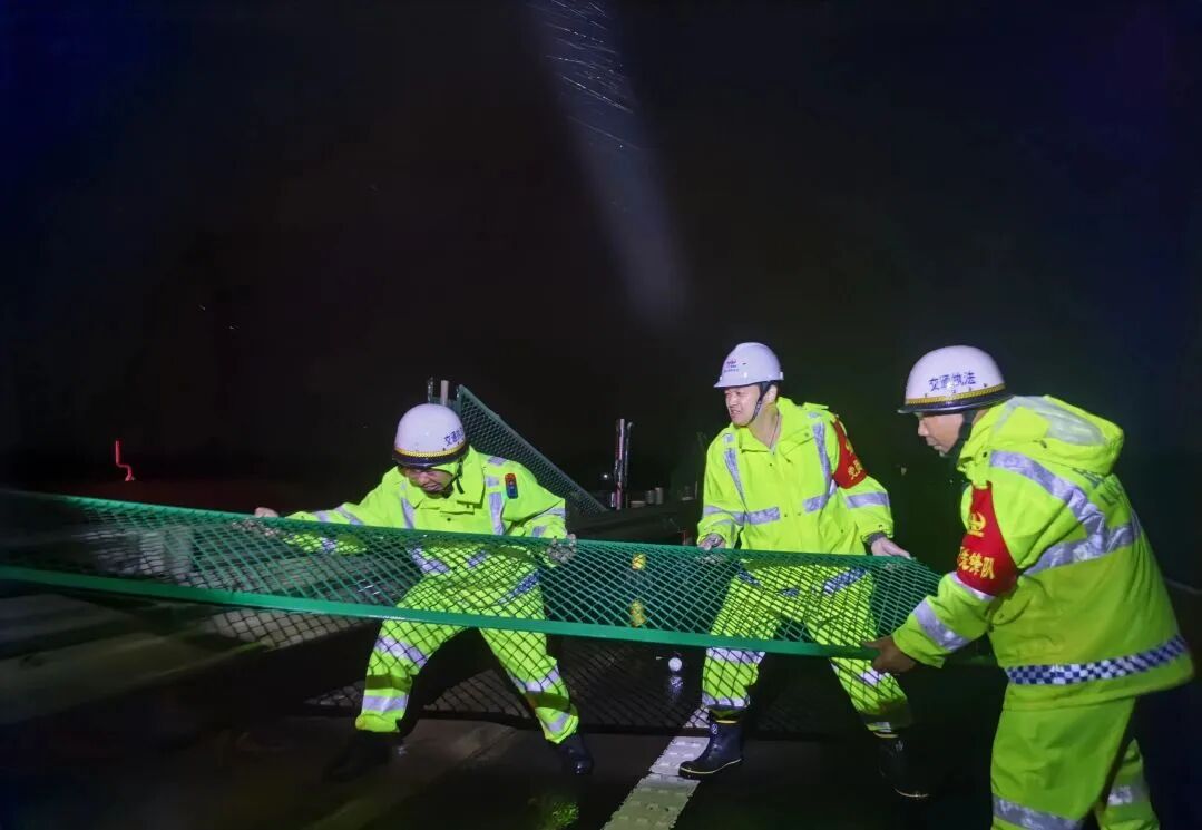 ▲渝湛、湛徐高速抢险队员清理被风吹落的防抛网。图源:广东交通集团
