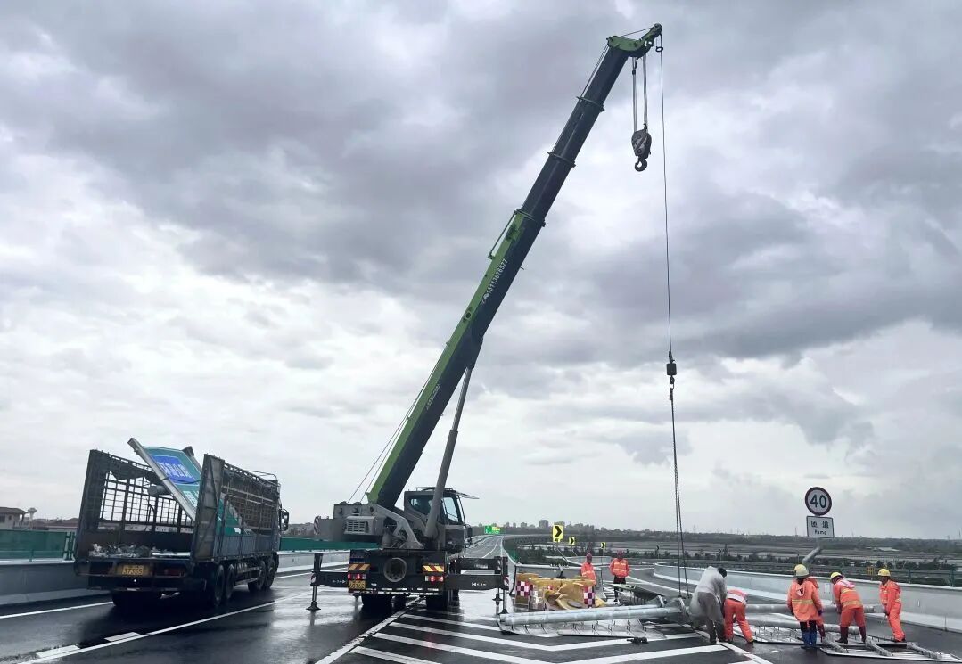 ▲南三岛大桥养护人员利用起重设备处置倒伏标志牌。图源:广东交通集团