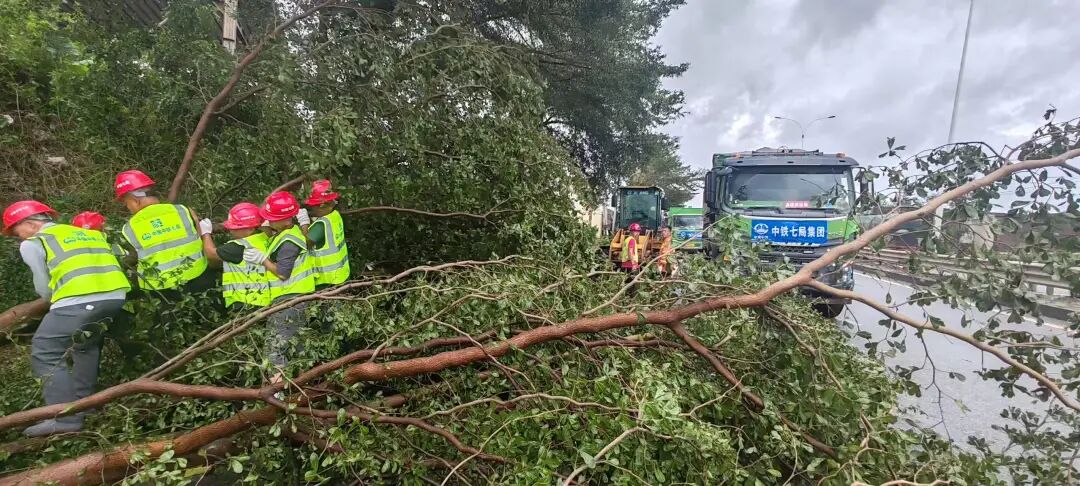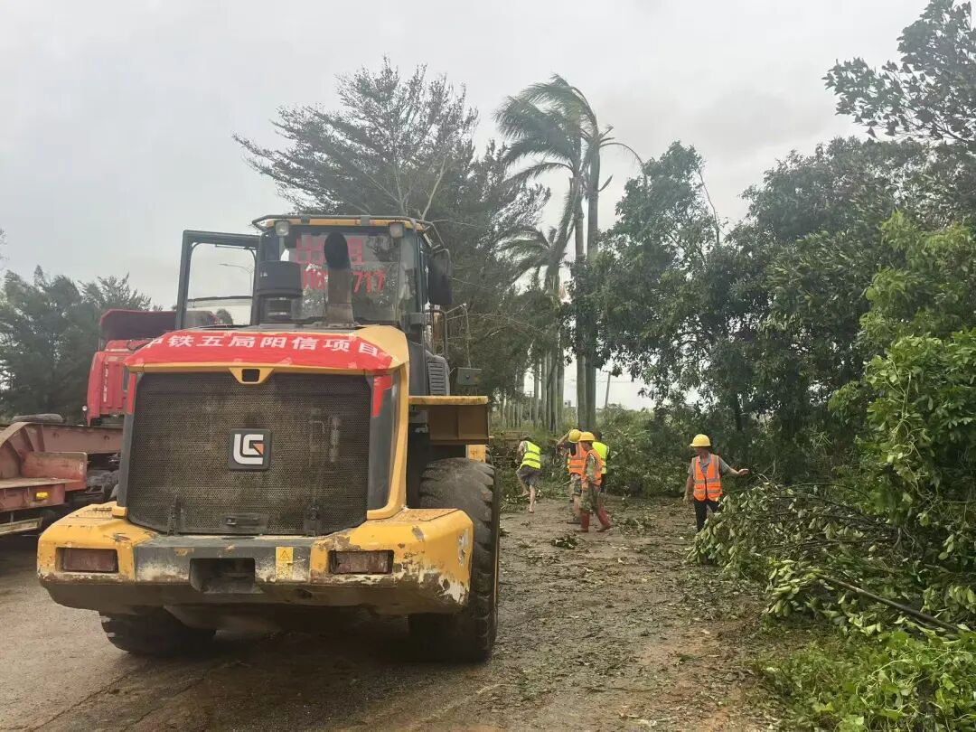 ▲中铁南方投资集团阳信高速公路项目应急救援队中铁七局分队处理被台风吹断的树木,并将其抬上装载机。