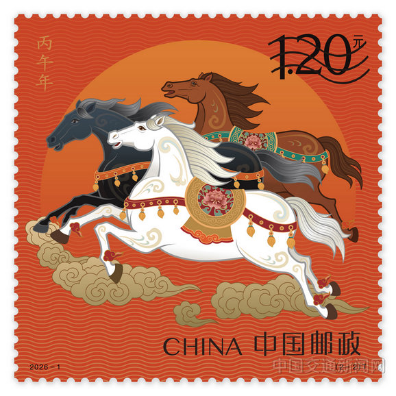 10月29日,中国邮政《丙午年》特种邮票图稿发布仪式在京举行。该套邮票由王红卫、赵恩重设计,邮票第一枚图名为“驰跃宏图”,以“腾跃新时代”为核心意象,展现了一匹红马奔驰于祥云之上,鬃毛如焰,四蹄生风。第二枚图名为“万骏臻福”,以“万马奔腾,驰骋千里”为核心意象,展现了3匹奔跑的骏马,寓意奔腾不息、共同奋进。