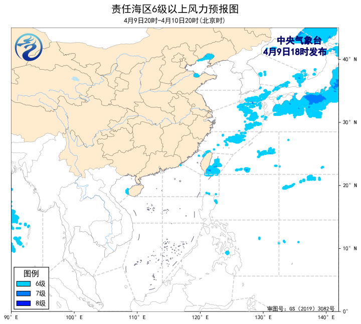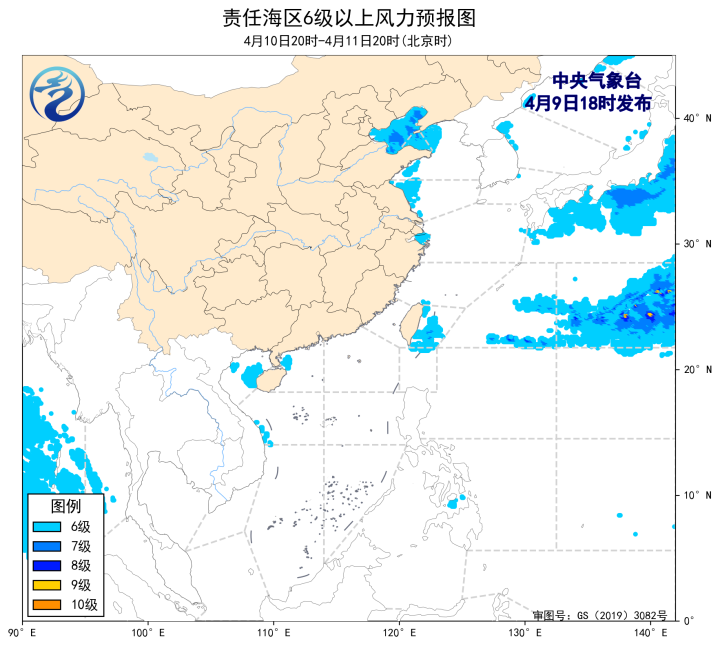 9日20时至10日20时,渤海将有4级以下增大到5~6级、阵风7级的西南风,台湾以东洋面将有4~6级、阵风7级的偏南到西南风。黄海南部偏南海域、东海西部海域、长江口及杭州湾附近海域、浙江沿岸海域、舟山群岛附近海域将有能见度不足1公里的大雾。