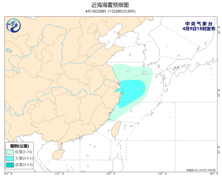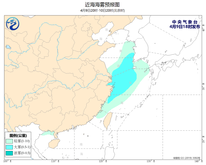 4月9日02时至14时,东海西北部海域出现了能见度不足1公里的大雾。