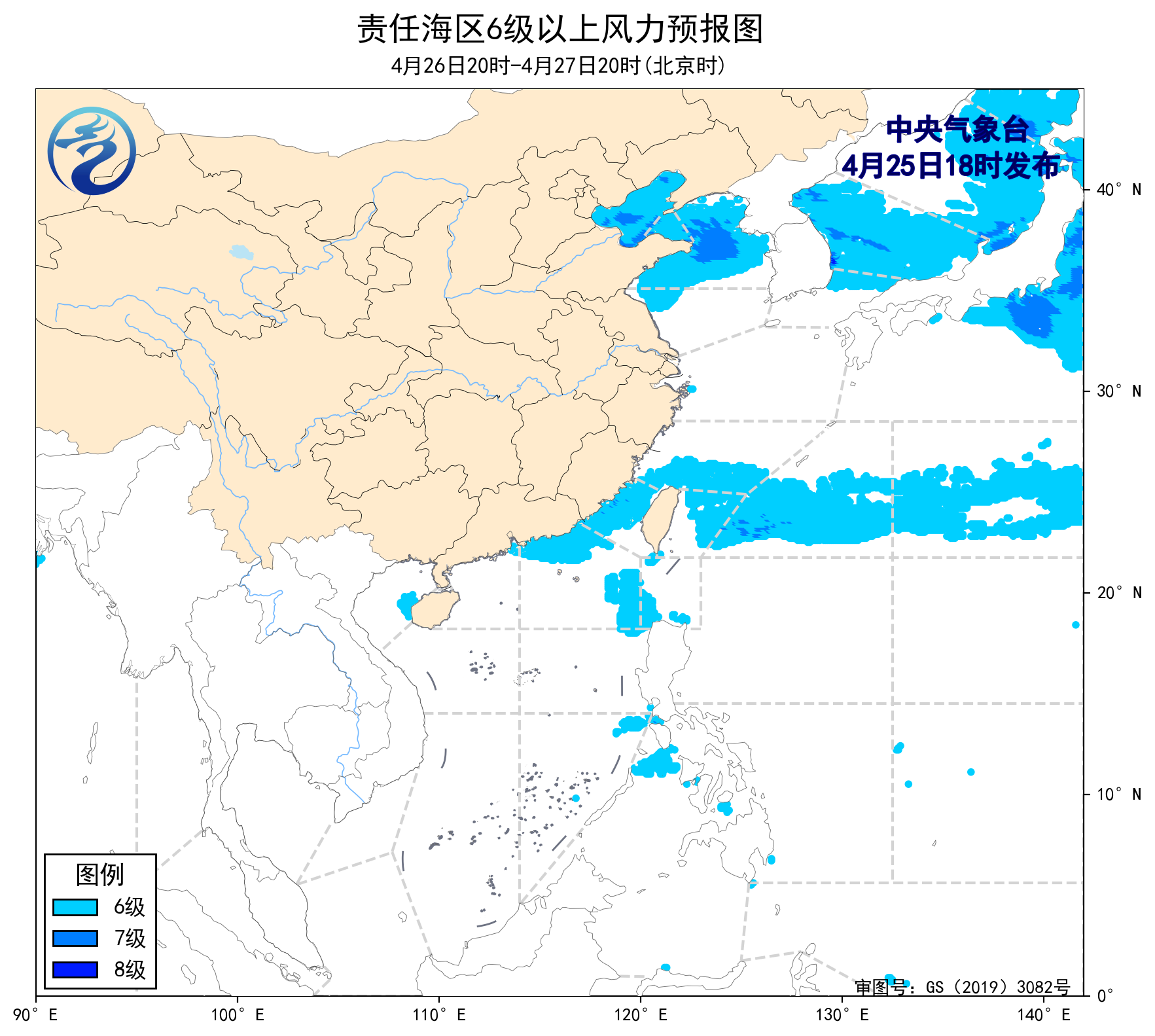 4月25日02时至14时,东海大部海域、台湾海峡、台湾以东洋面出现了5~7级、阵风8级的东北风或偏北风。