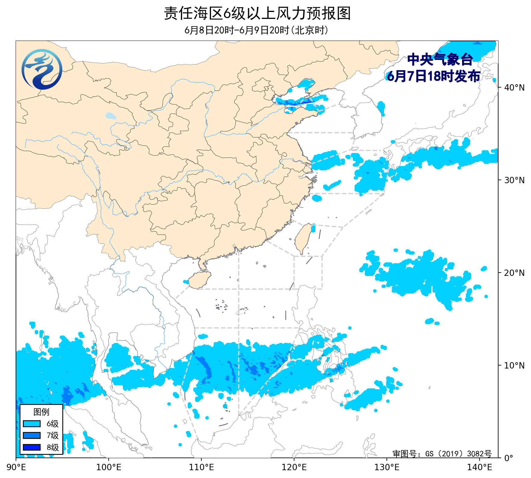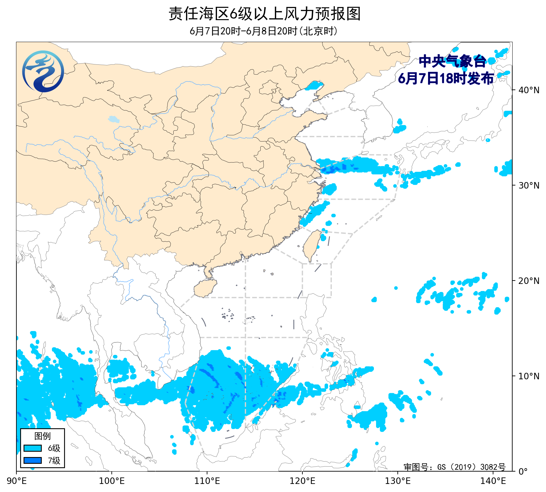 7日20时至8日20时,东海北部海域将有4~6级、阵风7级的西南风转偏东风,南海南部海域将有5~6级、阵风7级的西南风到偏西风。