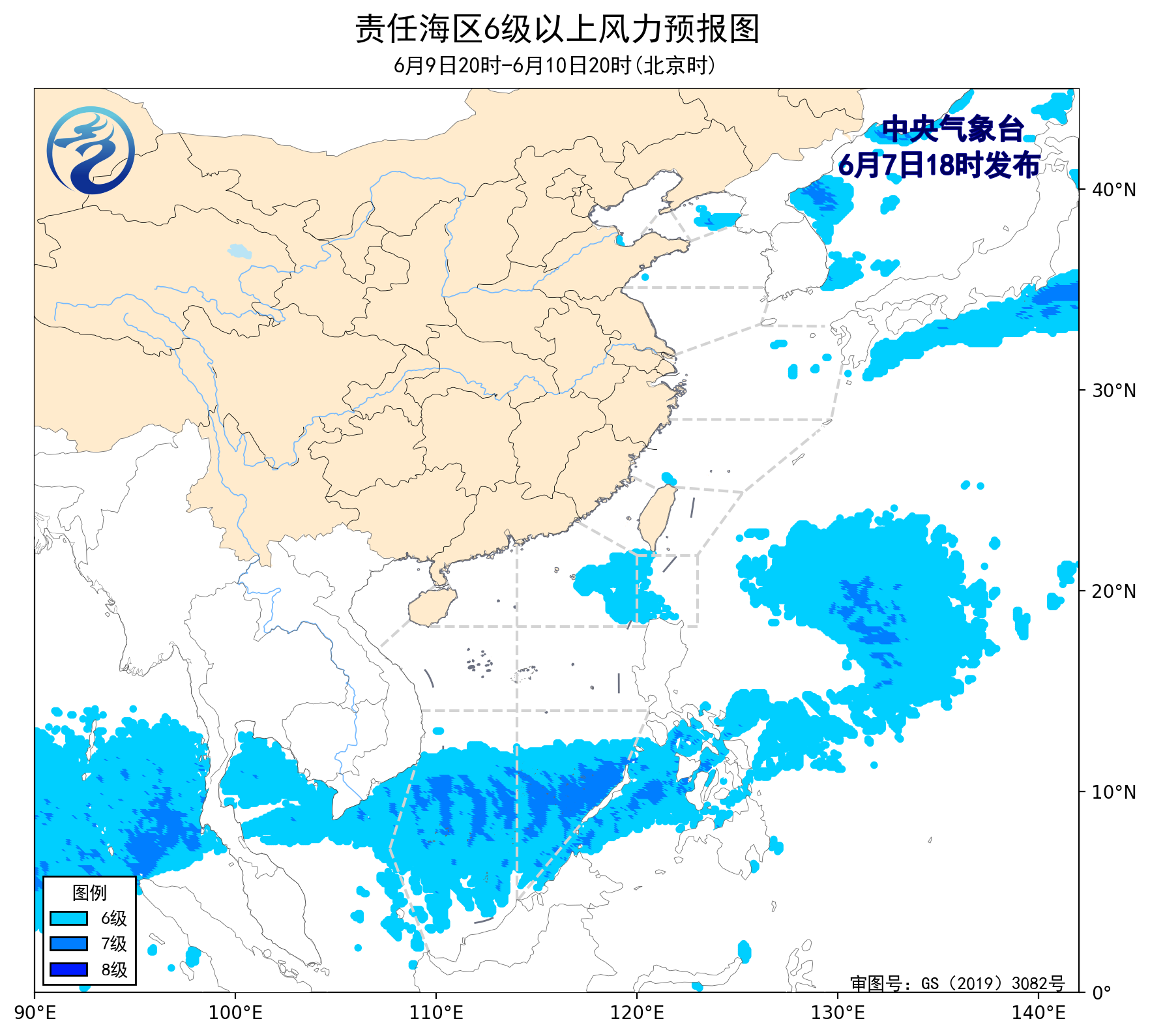 9日20时至10日20时,南海南部海域将有5~7级、阵风8级的偏西风,黄海北部海域将有5~6级、阵风7级的西南风减弱到4级以下的偏西风,南海东北部海域将有4~6级、阵风7级的偏东风。