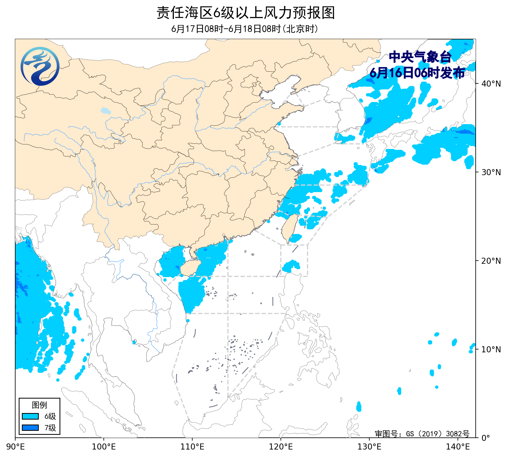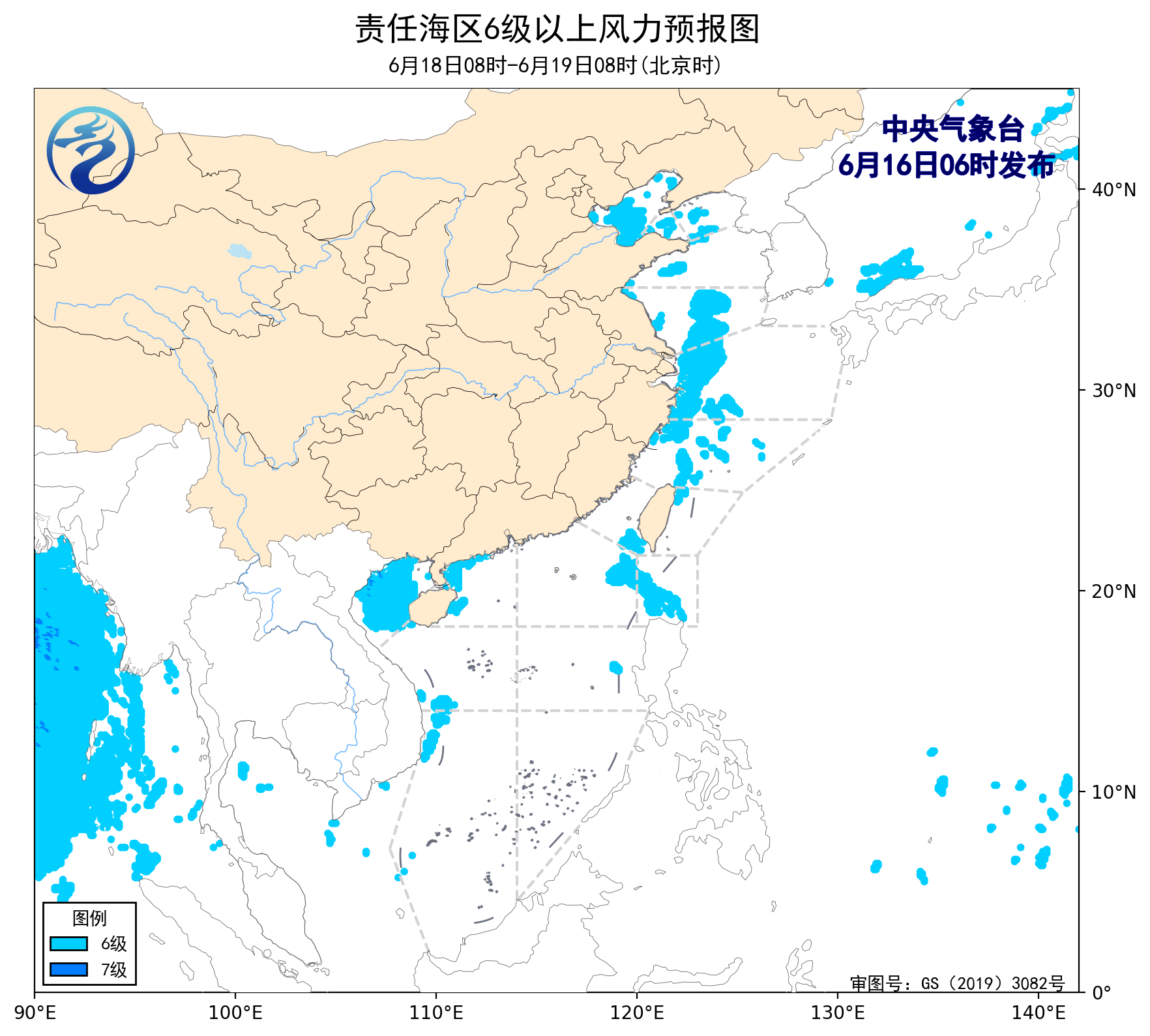 6月15日14时至16日02时,东海大部海域、台湾海峡、台湾以东洋面、南海东北部海域出现了5~7级、阵风8级的偏南风或西南风。黄海大部海域出现了能见度不足1公里的大雾。