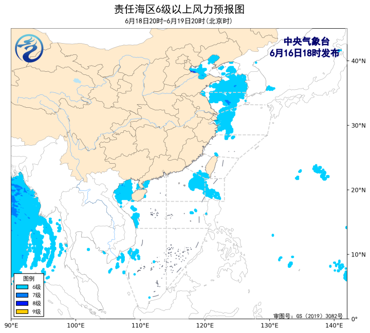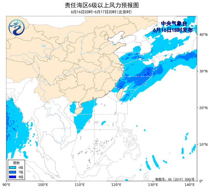 6月16日02时至14时,黄海中部海域、东海大部海域、台湾海峡、台湾以东洋面出现了5~7级、阵风8级的偏南风或西南风。