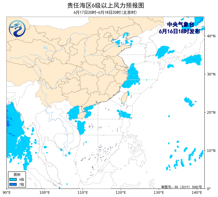 17日20时至18日20时,东海大部海域将有4~6级、阵风7级的西南风到偏南风,巴士海峡、北部湾、南海西北部和中西部海域将有4~6级、阵风7级的偏南到东南风。