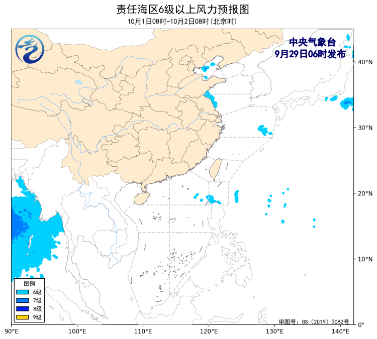 9月30日08时至10月1日08时,北部湾将有4~6级、阵风7级的东南风。