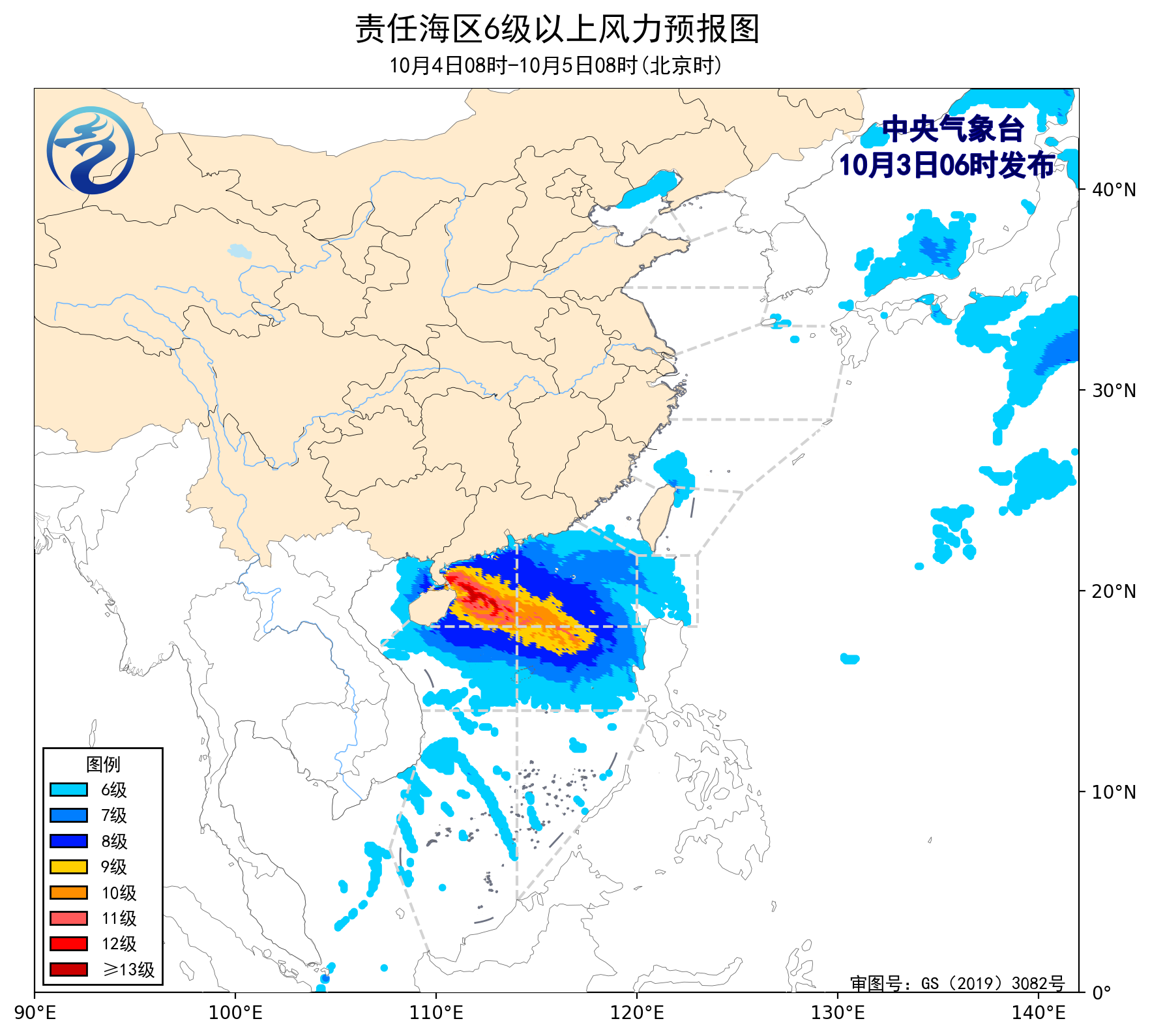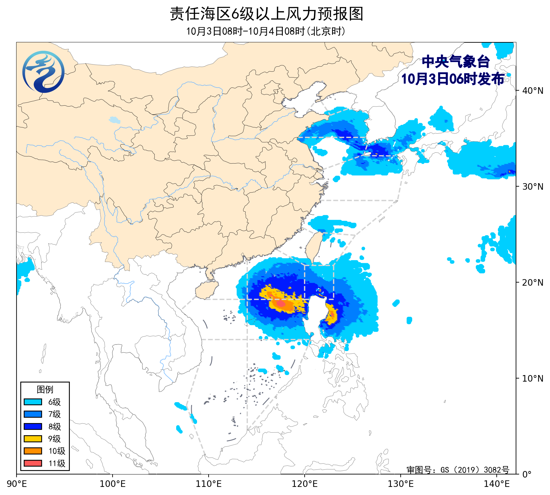 3日08时至4日08时,南海中东部海域将有6~7级、阵风8级的偏北风增大到8~9级、阵风10级的偏南风,巴士海峡将有7~8级、阵风9级的偏东到东南风,南海东北部海域将有7~8级、阵风9级的东北风到偏东风,黄海中部海域将有5~7级、阵风8级的东北风到偏北风,黄海南部海域将有6~7级、阵风8级的偏北风减弱到4~5级的偏西风,东海北部海域将有5~6级、阵风7级的西南风,南海西北部海域将有4级以下的偏东风增大到5~6级、阵风7级的偏北风。