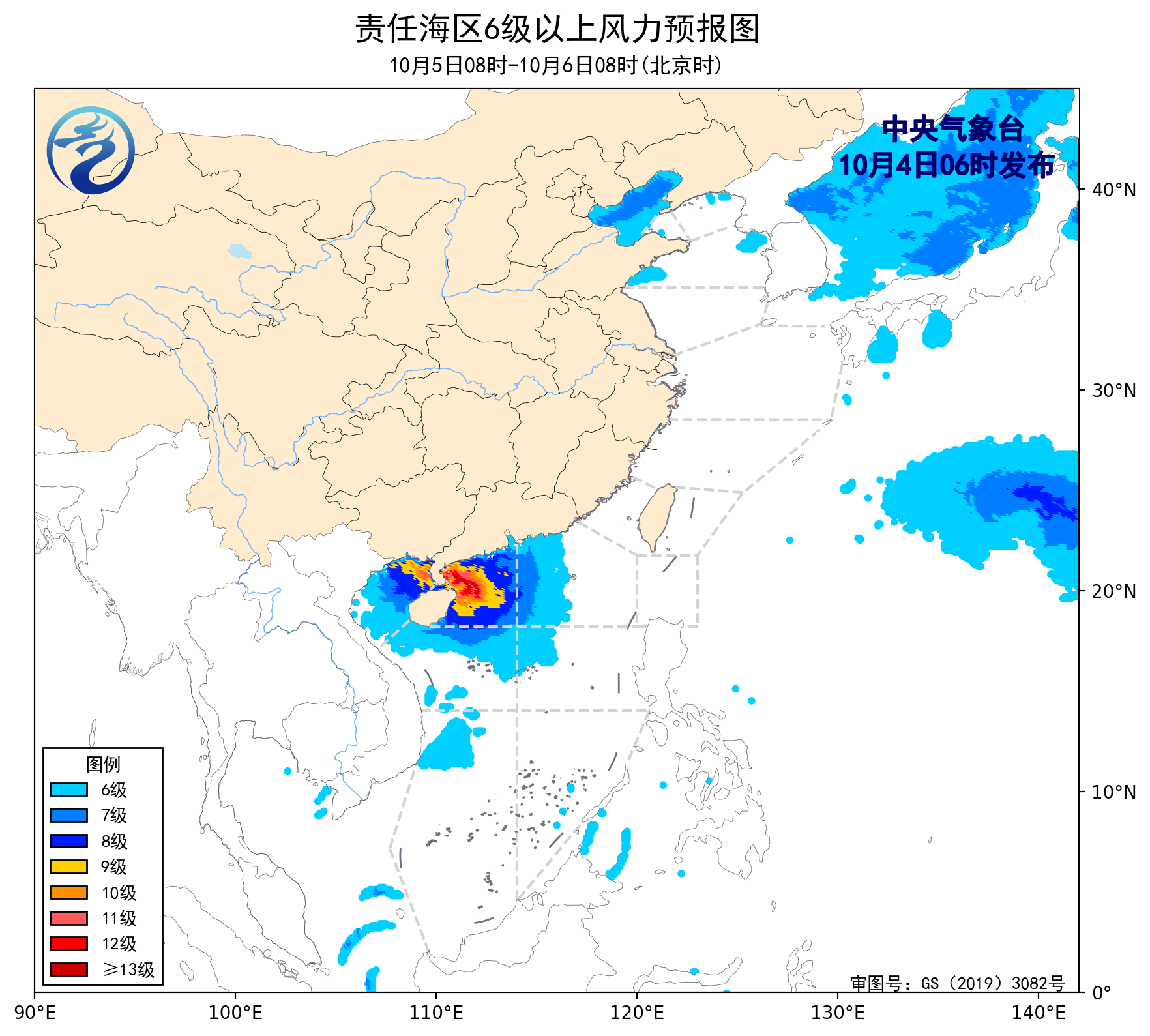 4日08时至5日08时,南海西北部海域将有10~11级、阵风12级的偏北风增大到12~13级、阵风14级的偏南风,南海东北部海域将有11~12级、阵风13级的偏南风,南海中东部海域将有10~11级、阵风12级的西南风减弱到8~9级、阵风10级的偏南风,琼州海峡将有4级以下的偏西风增大到8~9级、阵风10级的西北风,南海中西部海域将有7~9级、阵风10级的偏西到西南风,北部湾将有4级以下的偏东风增大到6~7级、阵风8级的西北风,渤海将有4级以下的西南风增大到5~6级、阵风7级的东北风,南海西南部海域将有4~6级、阵风7级的西南风,东海南部海域、台湾海峡、巴士海峡将有4~6级、阵风7级的偏南到东南风。
