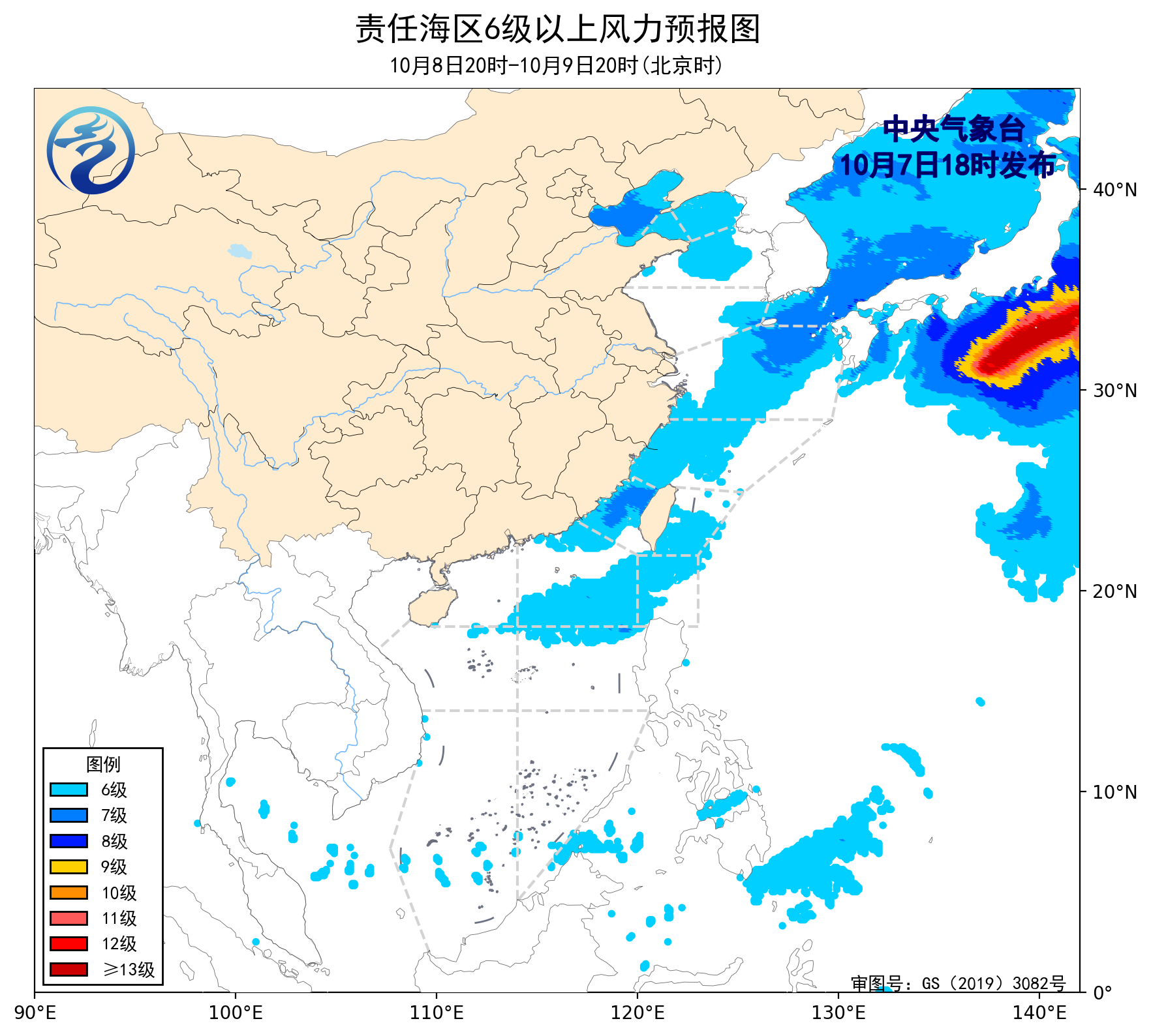 7日20时至8日20时,渤海、台湾海峡将有6~7级、阵风8级的东北风,渤海海峡、黄海大部海域、东海大部海域、台湾以东洋面、巴士海峡、南海东北部和中东部海域将有4~6级、阵风7级的偏北到东北风。