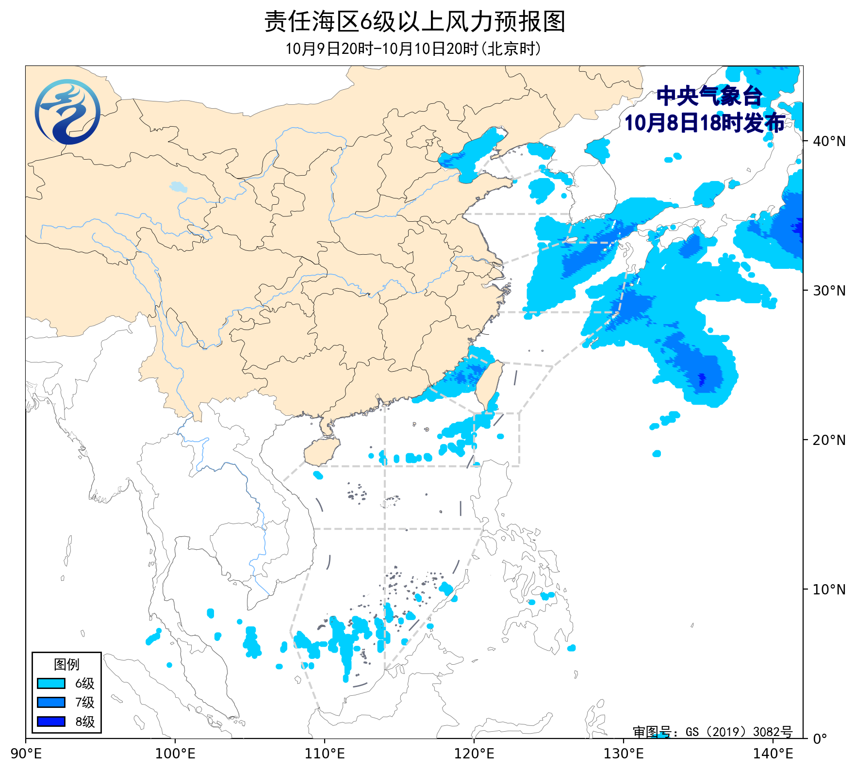 10月8日02时至14时,渤海出现了7~8级、阵风9级的东北风,黄海中部海域、台湾海峡、台湾以东洋面、巴士海峡出现了5~6级、阵风7级的东北风或偏北风,南海东北部海域出现了5~6级、阵风7级的偏东风,南海东南部海域出现了5~6级、阵风7级的偏西风。