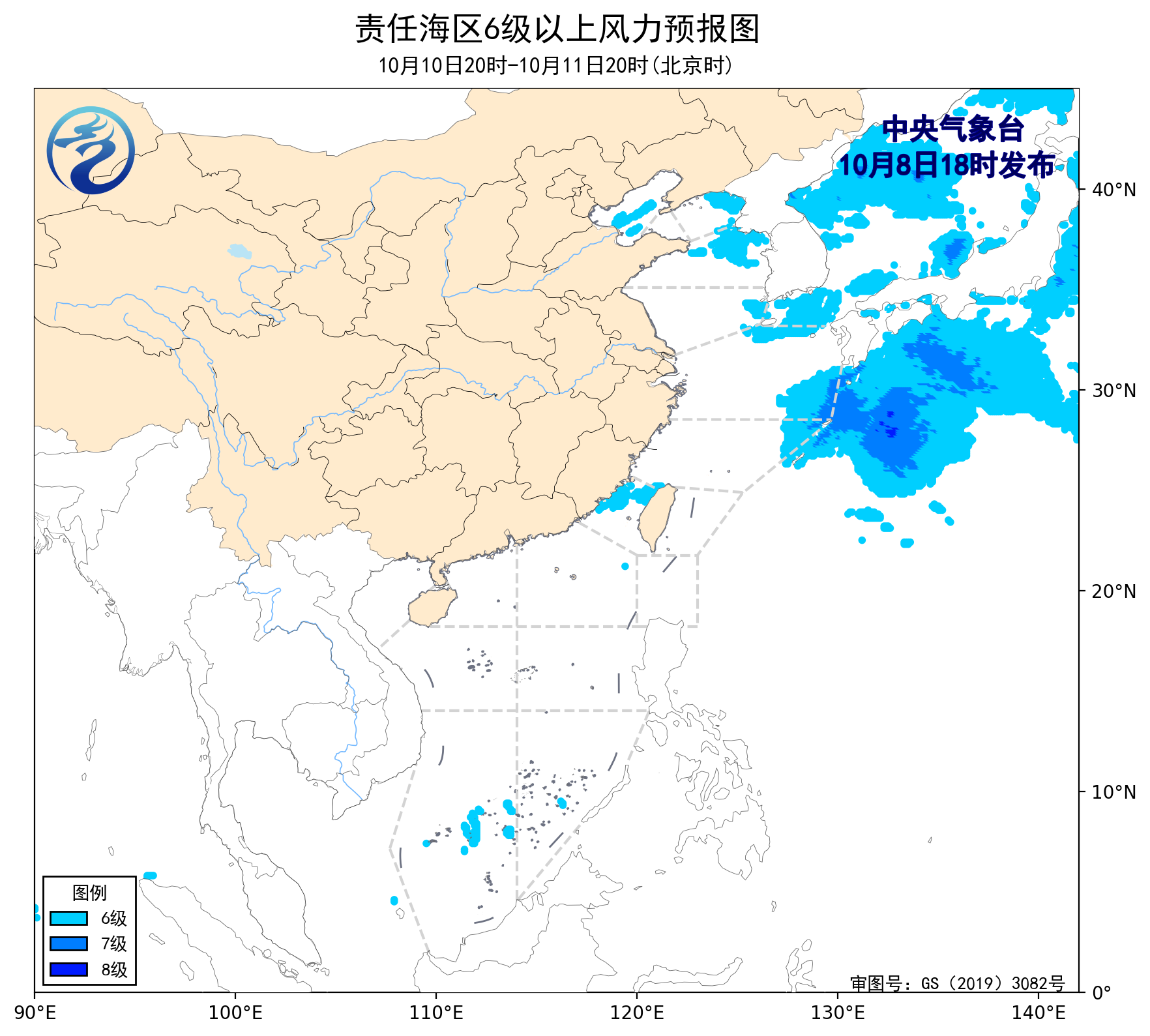 预计,10月11日夜间至10月14日夜间,渤海、渤海海峡、东海大部海域将有6~7级、阵风8级的风,黄海大部海域将有6~8级、阵风9级的大风,台湾海峡、巴士海峡、南海西北部海域、南海东北部海域、南海西南部海域、南海东南部海域将有5~6级、阵风7级的风。