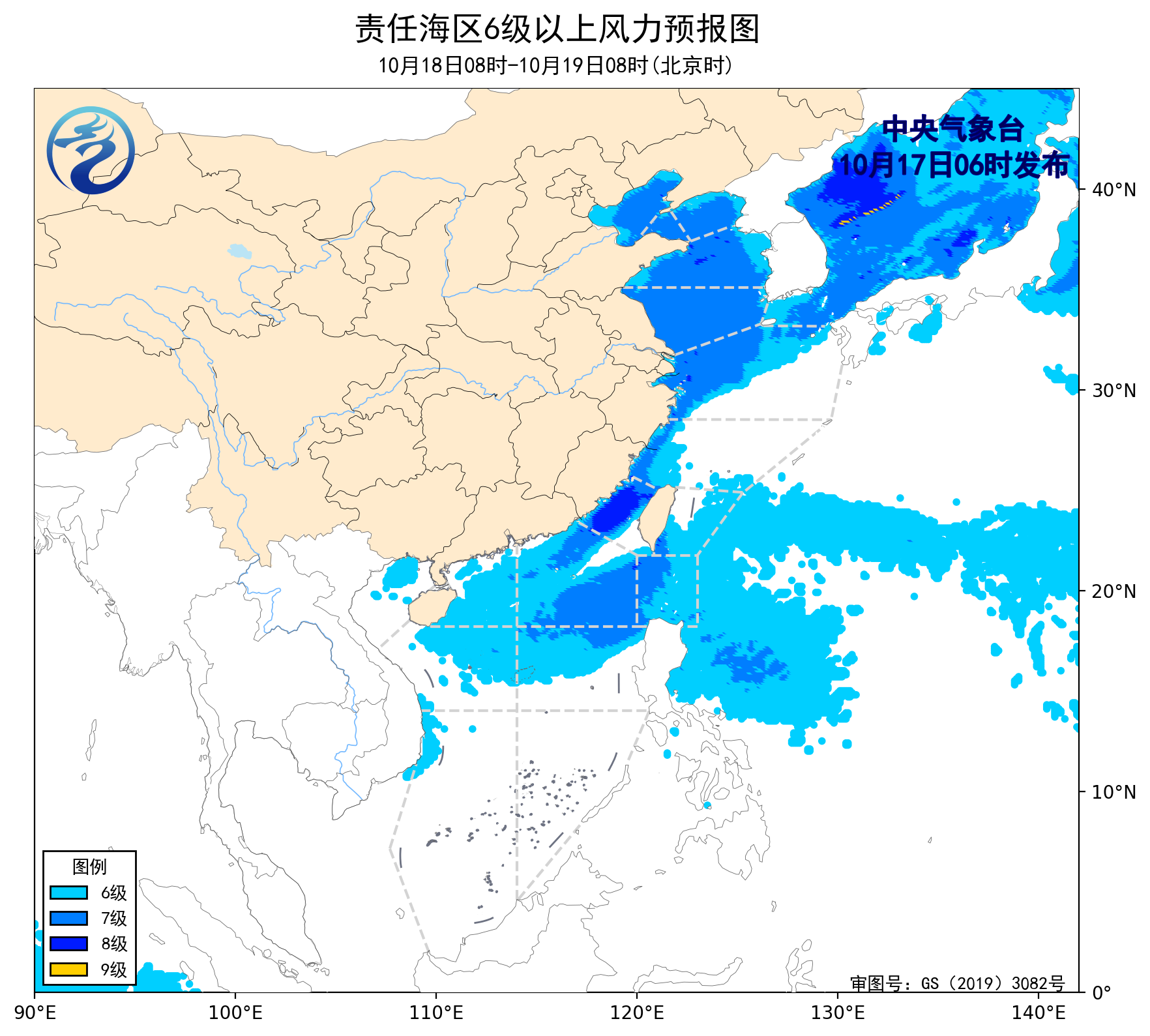 17日08时至18日08时,渤海、渤海海峡、黄海大部海域将有6~8级、阵风9级的大风,台湾海峡、巴士海峡、南海北部和中部海域将有5~7级、阵风8级的东北风。