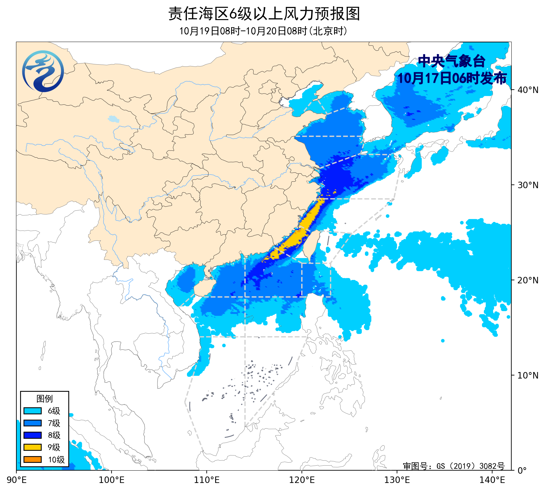 10月16日14时至17日02时,渤海、黄海中部海域、台湾海峡出现了5~6级、阵风7级的东北风或偏北风,黄海南部海域、东海北部海域、巴士海峡、南海东北部海域出现了5~6级、阵风7级的偏东风。
