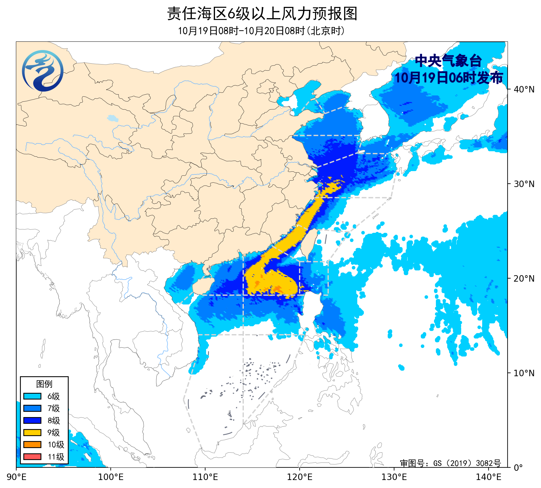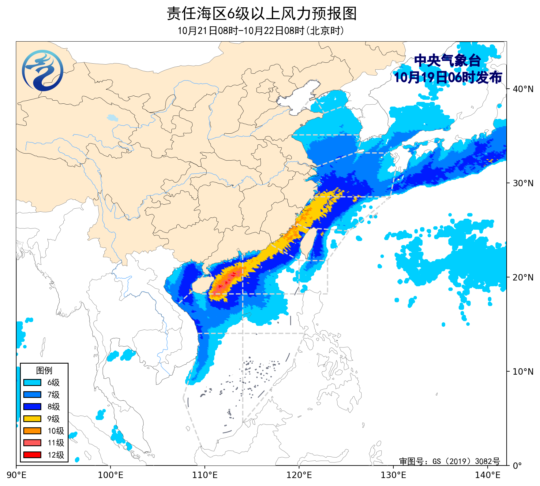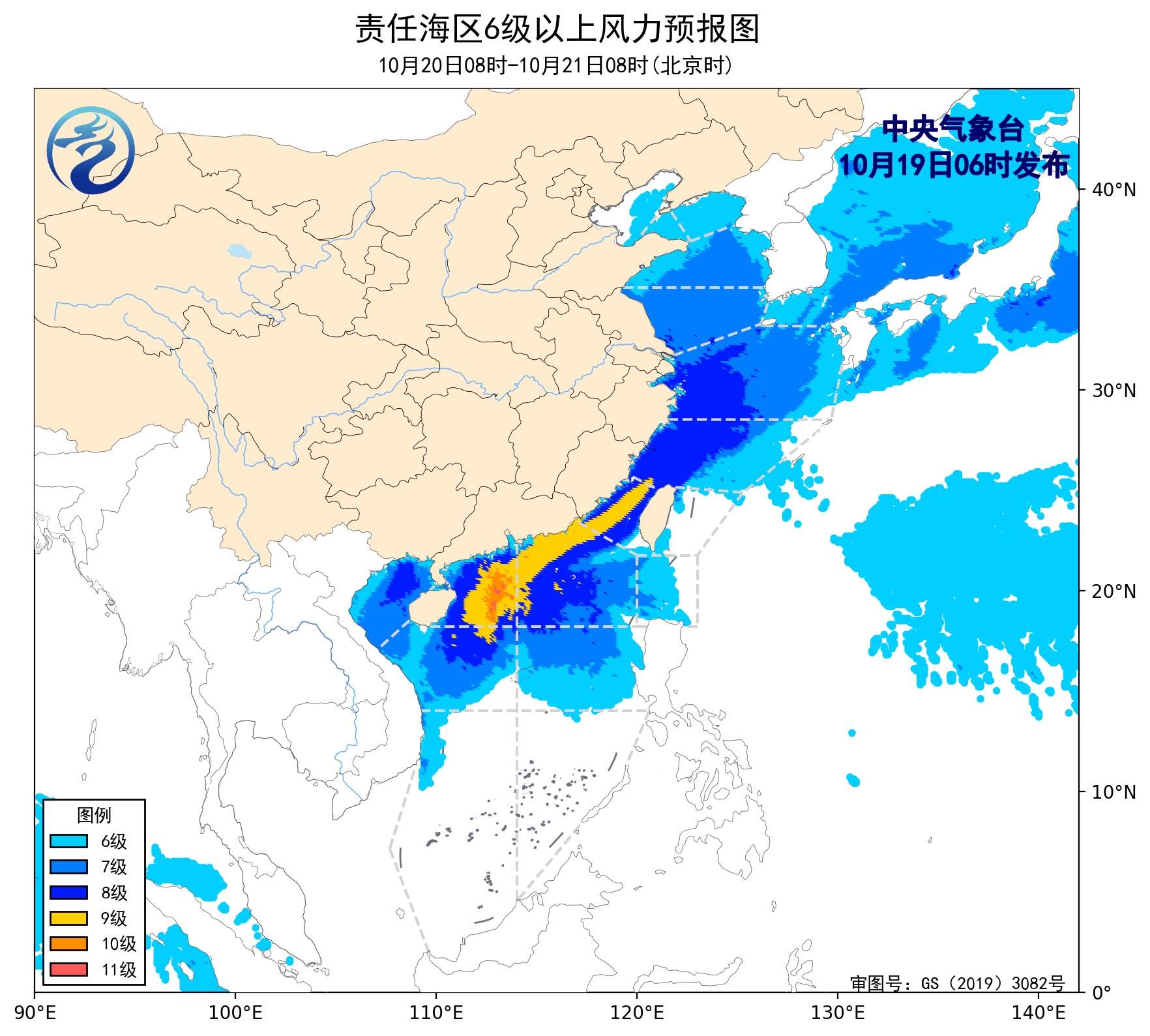 19日08时至20日08时,台湾海峡将有7~9级、阵风10级的东北风,东海大部海域、南海东北部海域将有6~8级、阵风9级的偏北到东北风,巴士海峡将有6~8级、阵风9级的偏东风,南海中东部海域将有6~7级、阵风8级的东北风转偏南风,黄海大部海域、北部湾、南海西北部和中西部海域将有5~7级、阵风8级的偏北到东北风,渤海、渤海海峡、台湾以东洋面、琼州海峡将有4~6级、阵风7级的偏北到东北风。