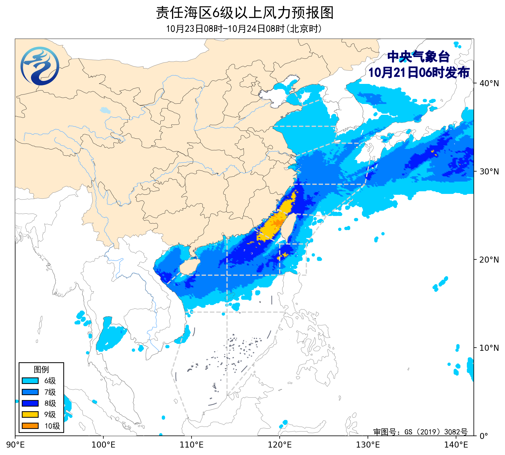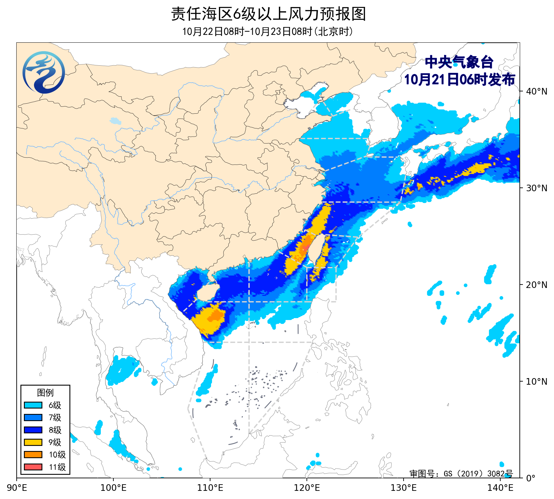 21日08时至22日08时,南海西北部海域将有8~10级、阵风11级的东北风,南海中西部海域将有8~9级、阵风10级的偏北到西北风,东海南部海域、台湾海峡将有8~9级、阵风10级的偏北到东北风,东海北部海域、台湾以东洋面、北部湾、南海东北部海域将有7~8级、阵风9级的偏北到东北风,黄海南部海域、琼州海峡将有6~7级、阵风8级的偏北到东北风,南海中东部海域将有5~6级、阵风7级的东南风到偏东风,渤海海峡、黄海北部和中部海域、巴士海峡将有5~6级、阵风7级的偏北到东北风。
