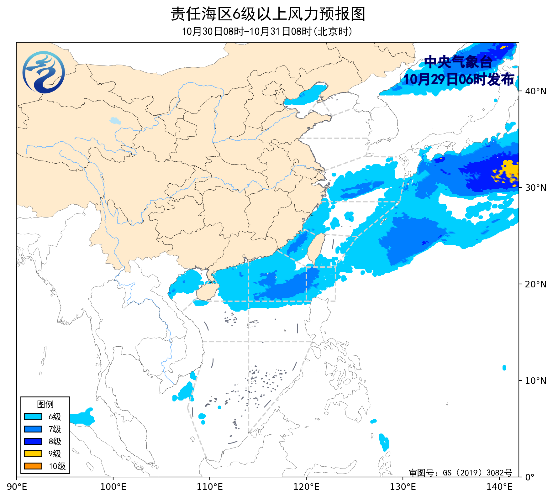 10月28日14时至29日02时,东海北部海域、北部湾、南海中西部海域出现了5~7级、阵风8级的东北风或偏东风,东海南部海域、台湾海峡、台湾以东洋面、巴士海峡、南海北部海域出现了6~8级、阵风9级的东北风或偏北风。