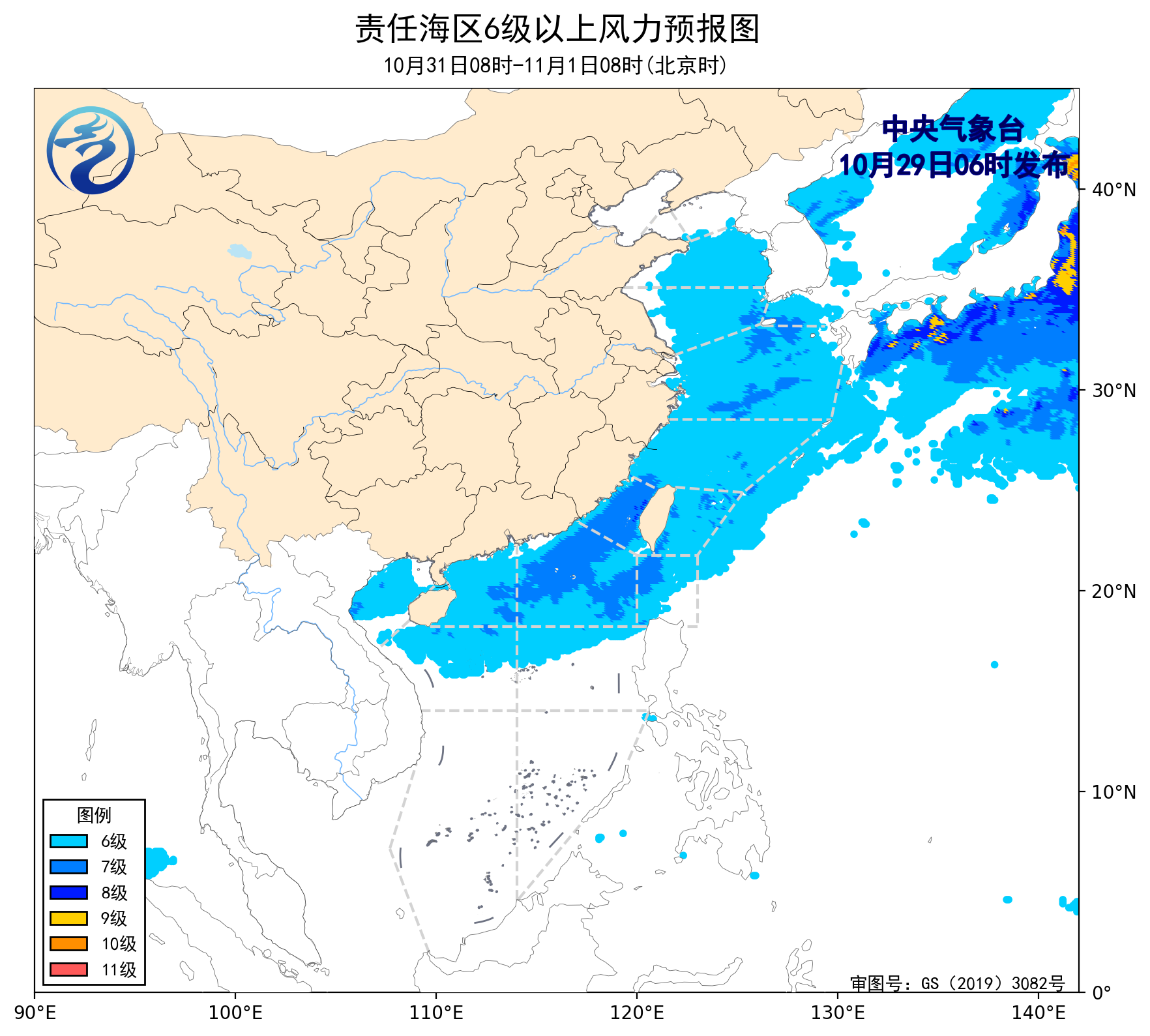 10月31日08时至11月1日08时,台湾海峡、巴士海峡、南海东北部海域将有5~7级、阵风8级的东北风,东海北部海域将有5~6级、阵风7级的东北风转西北风,黄海中部和南部海域将有5~6级、阵风7级的偏北到西北风,东海南部海域、台湾以东洋面、北部湾、琼州海峡、南海中部和西北部海域将有5~6级、阵风7级的偏北到东北风。