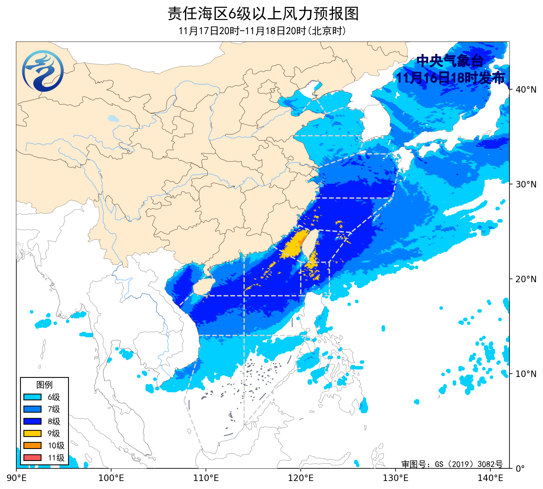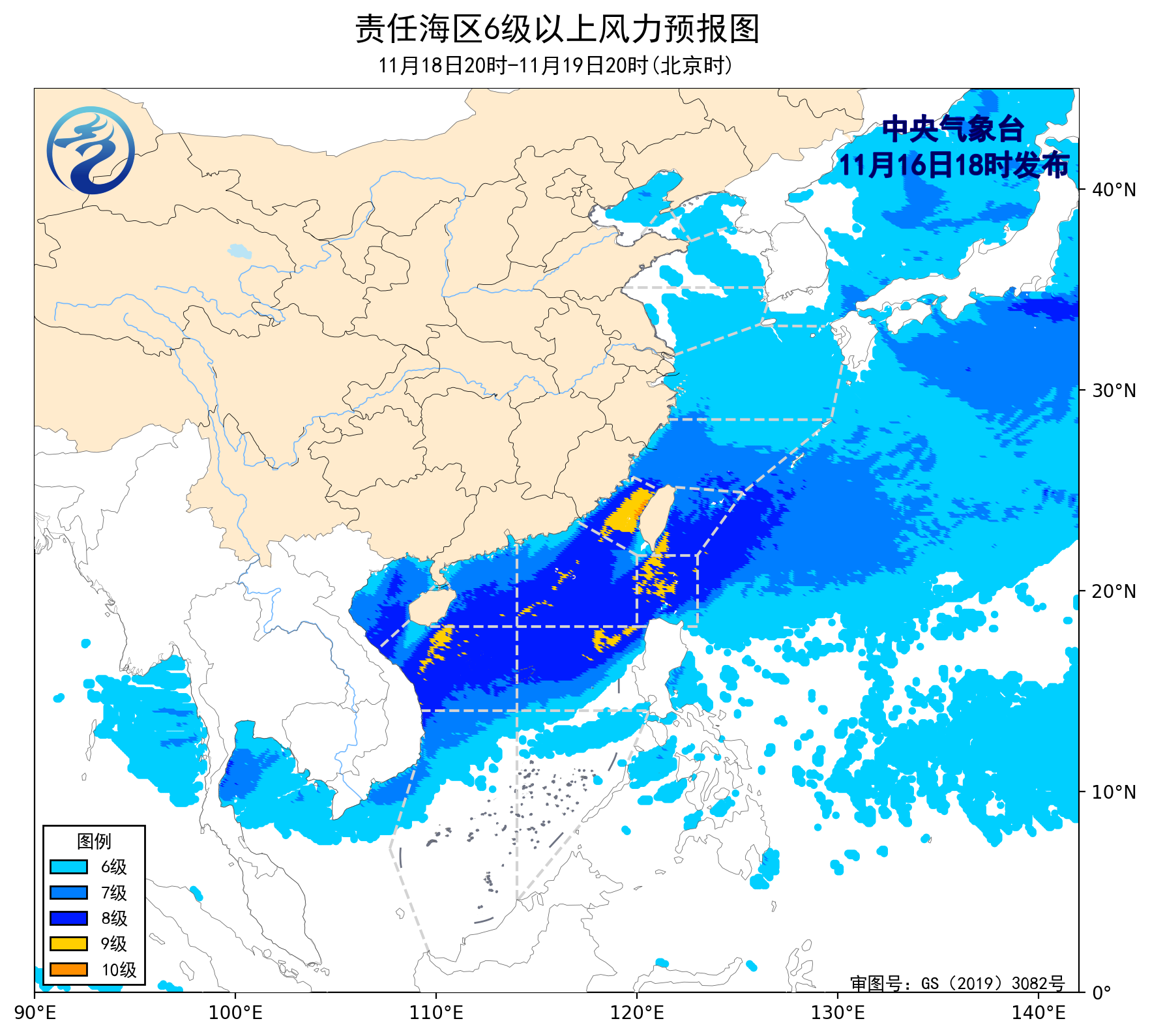 预计,19日夜间至23日白天,渤海、渤海海峡、黄海大部海域将有5~6级、阵风7级的风,东海南部海域、台湾海峡、台湾以东洋面、巴士海峡、南海大部海域、北部湾将有7~8级、阵风9级的大风,其中台湾海峡、台湾以东洋面、巴士海峡、南海北部的部分海域风力可达9级、阵风10级。
