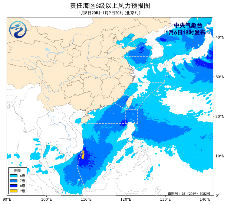 预计,1月9日夜间至1月12日夜间,渤海、台湾海峡将有7~8级、阵风9级的大风,渤海海峡、台湾以东洋面将有6~8级、阵风9级的大风,黄海大部海域将有7~9级、阵风10级的大风,东海大部海域将有6~7级、阵风8级增大至8~9级、阵风10级的大风,巴士海峡将有8~9级、阵风10级的大风,北部湾将有5~6级、阵风7级的风,南海大部海域将有8~9级、阵风10级减弱至6~7级、阵风8级的风。