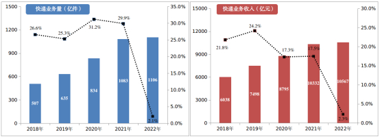 2022年邮政行业寄递业务量完成1390.9亿件,同比增长2.7%。其中,快递业务量完成1105.8亿件,同比增长2.1%。