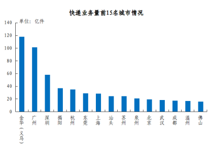 快递业务量排名前十五位的城市依次是金华(义乌)、广州、深圳、揭阳、杭州、东莞、上海、汕头、苏州、泉州、北京、武汉、成都、温州和佛山,其快递业务量合计占全部快递业务量的比重达到51.1%。