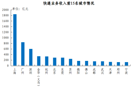 快递业务收入排名前十五位的城市依次是上海、广州、深圳、金华(义乌)、杭州、北京、东莞、苏州、揭阳、佛山、成都、武汉、天津、郑州和宁波,其快递业务收入合计占全部快递业务收入的比重达到55.5%。