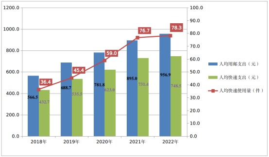 2018-2022年人均用邮支出、快递支出和快递使用量情况