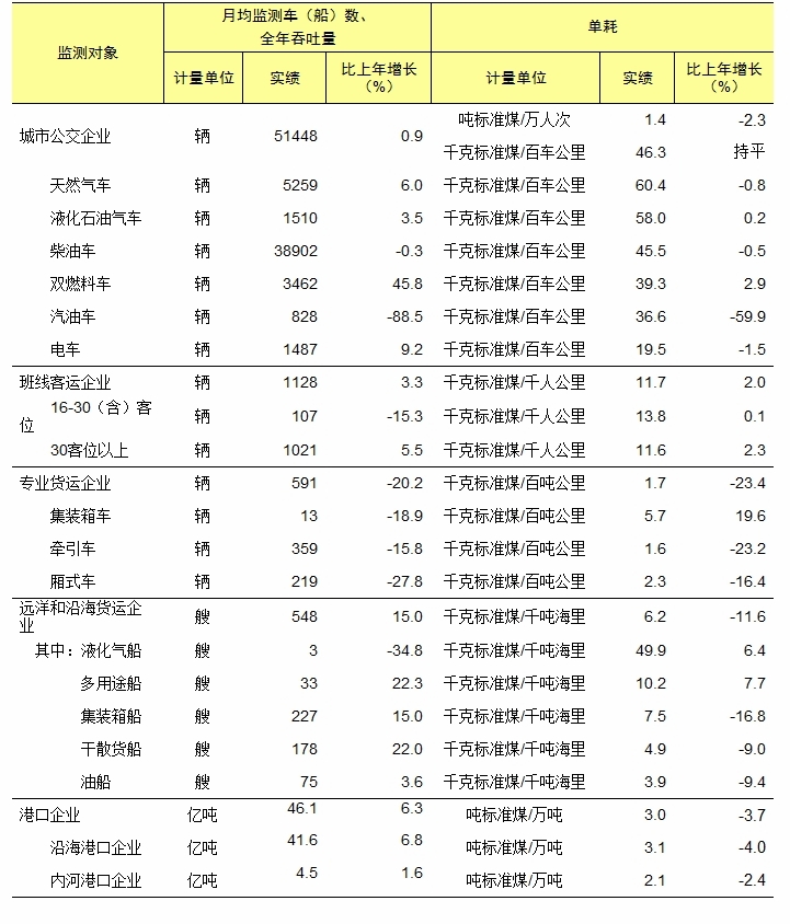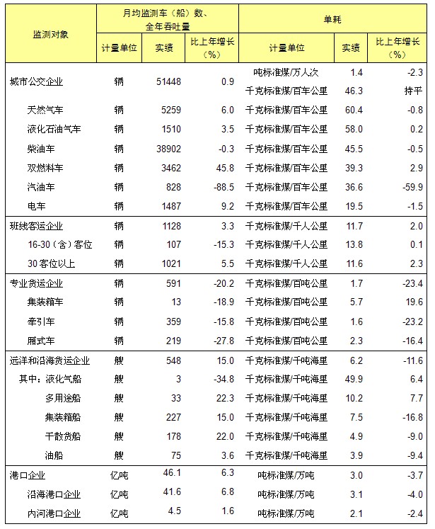 全年共有公路水路交通运输能耗监测企业97家。监测的城市公交企业每万人次单耗1.4吨标准煤,比上年下降2.3%。班线客运企业每千人公里单耗11.7千克标准煤,增长2.0%。专业货运企业每百吨公里单耗1.7千克标准煤,下降23.4%。远洋和沿海货运企业每千吨海里单耗6.2千克标准煤,下降11.6%。港口企业每万吨单耗3.0吨标准煤,下降3.7%。