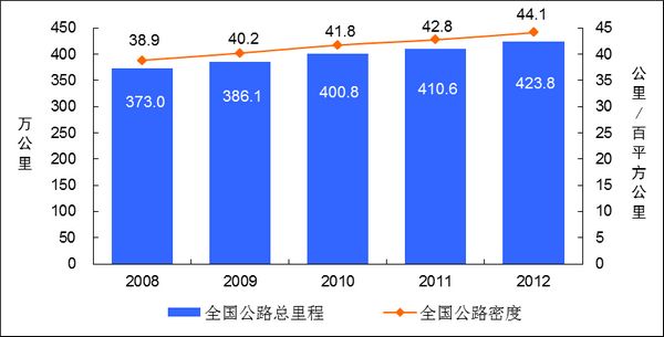 图1 2008-2012年全国公路总里程及公路密度