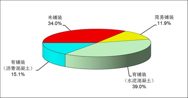 全国有铺装路面和简易铺装路面公路里程279.86万公里,比上年末增加18.29万公里,占公路总里程的66.0%,提高2.3个百分点。各类型路面里程分别为:有铺装路面229.51万公里,其中沥青混凝土路面64.19万公里,水泥混凝土路面165.32万公里,分别增加19.17万公里、5.06万公里和14.10万公里;简易铺装路面50.35万公里,减少0.88万公里;未铺装路面143.89万公里,减少5.18万公里。