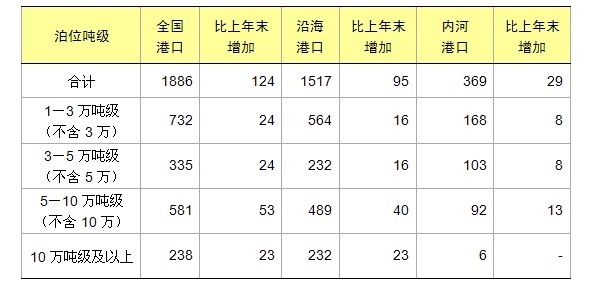 全国港口拥有万吨级及以上泊位1886个,比上年末增加124个。其中,沿海港口万吨级及以上泊位1517个,增加95个;内河港口万吨级及以上泊位369个,增加29个。