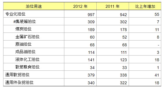 全国万吨级及以上泊位中,专业化泊位997个,通用散货泊位379个,通用件杂货泊位340个,比上年末分别增加55个、41个和18个。