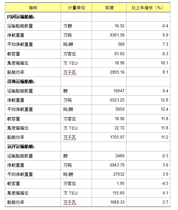 年末全国拥有水上运输船舶17.86万艘,比上年末减少0.4%;净载重量22848.62万吨,增长7.5%;平均净载重量1279.38吨/艘,增长7.8%;载客量102.51万客位,增长1.7%;集装箱箱位157.36万TEU,增长6.7%;船舶功率6389.46万千瓦,增长7.4%。