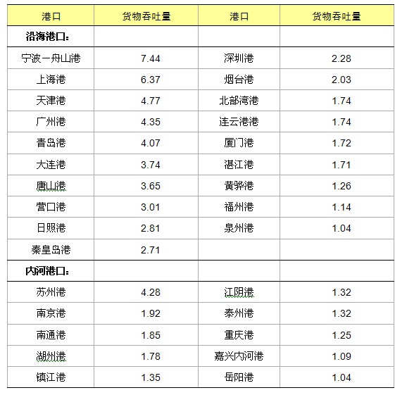 货物吞吐量超过亿吨的港口由上年的26个增加到29个。其中,沿海亿吨港口19个,内河亿吨港口10个。