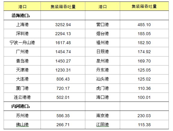 集装箱吞吐量超过100万TEU的港口由上年的19个增加到22个。其中,沿海港口18个,内河港口4个。