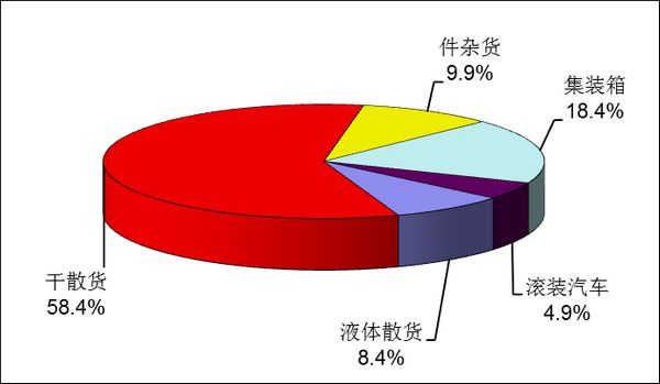 全国港口完成液体散货吞吐量9.06亿吨,比上年下降0.5%;干散货吞吐量62.91亿吨,增长7.4%;件杂货吞吐量10.64亿吨,增长4.6%;集装箱吞吐量(按重量计算)19.81亿吨,增长11.7%;滚装汽车吞吐量(按重量计算)5.33亿吨,增长10.2%。液体散货、干散货、件杂货、集装箱和滚装汽车在港口货物吞吐量中所占比重分别为8.4%、58.4%、9.9%、18.4%和4.9%。