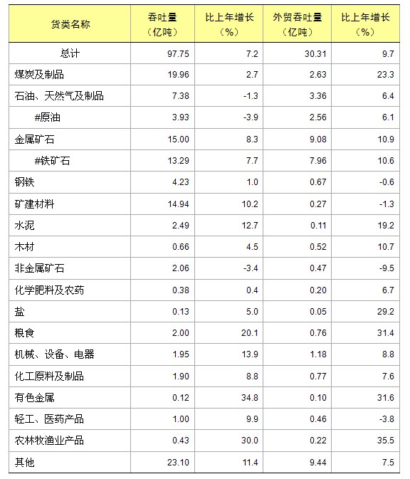 全国规模以上港口完成货物吞吐量97.75亿吨,比上年增长7.2%。其中,完成煤炭及制品吞吐量19.96亿吨,石油、天然气及制品吞吐量7.38亿吨,金属矿石吞吐量15.00亿吨,分别增长2.7%、下降1.3%和增长8.3%。